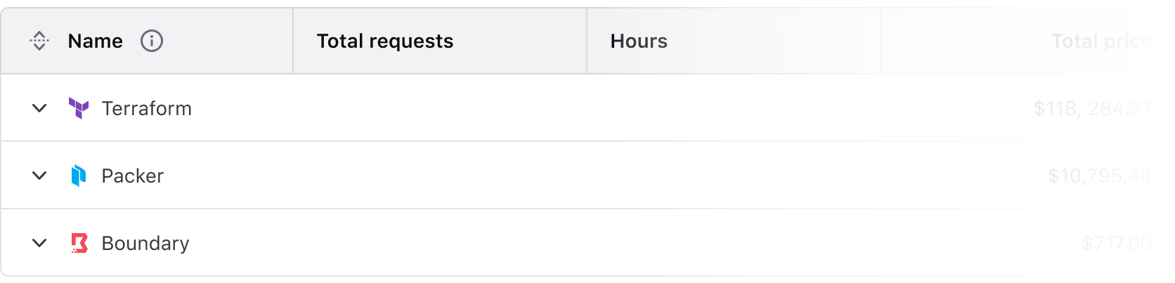 Advanced Table expandable rows. The parent rows display a summary of a Hashicorp product and the total price, the children rows show a breakdown of each billing item from that product and their individual cost.